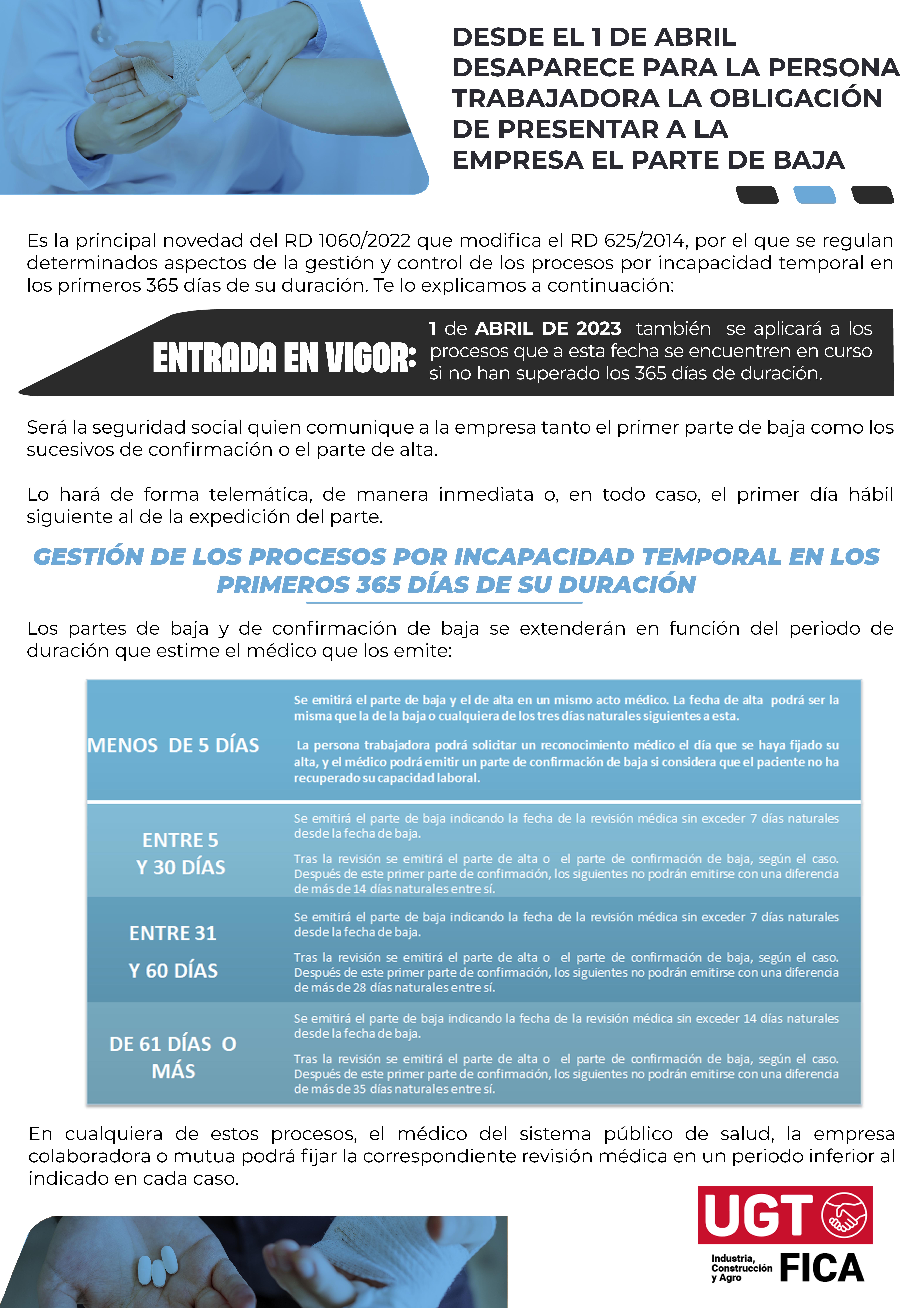 El pasado 27 de diciembre se publicó el RD 1060/2022 que modifica el RD 625/2014 por el que se regulan determinados aspectos de la gestión y control de los procesos de IT en los primeros 365 días de su duración. Uno de los más significativos es que a partir del 01/04/2023 desaparece para la persona trabajadora la obligación de presentar a la empresa el parte de baja, es decir las personas trabajadoras ya no tendrán que entregar los partes médicos, y las Mutuas, empresas y entidades gestoras e Instituto Nacional de la Seguridad Social tendrán la obligación de comunicarse telemáticamente.